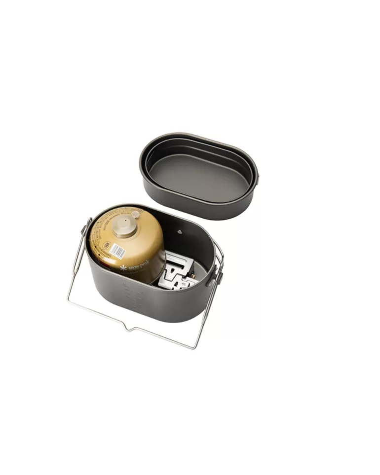 The cook set is large enough to store fuel canisters, a small stove, and utensils for a compact kitchen kit.
