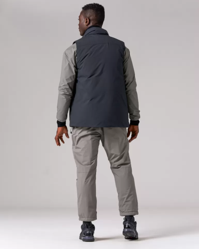 The Vest features an offset double-zippered front to avoid contact with your chin, a stand collar, two zippered pockets at the waist, a drawcord adjustable hem, and a large zippered chest pocket with internal compartments.