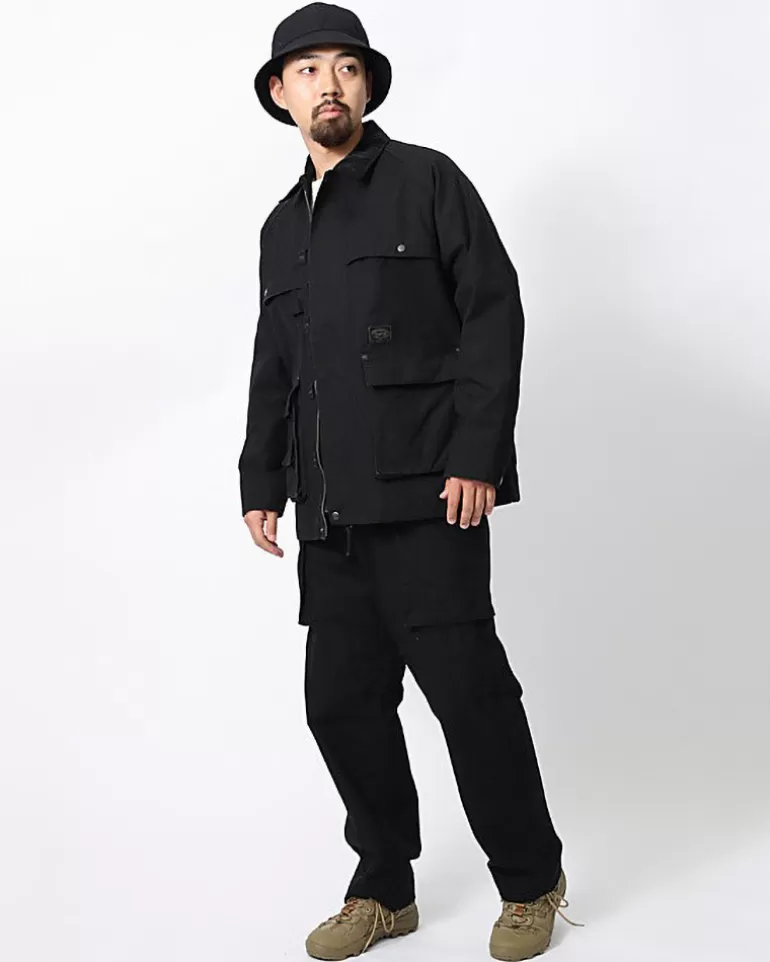 The Takibi Canvas Jacket is designed with a loose fit with the hem hitting below the waist. We recommend taking your normal size for a loose fit. The model stands 6′ and wears size L.