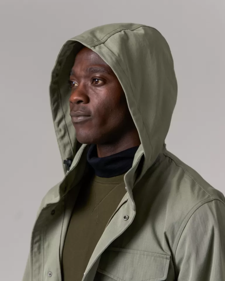 The Takibi Ripstop Field Jacket is a durable, fire-resistant jacket. The jacket features four large flap pockets on the front, a packable hood, and elastic spindle adjusters at the hood and hem for a customizable fit. Additional features include an accessory loop under the right breast pocket, ventilated panels on the back, and adjustable cuff tabs with a triangular flap. The material is an aramid-cotton blend with ripstop stitching throughout for fire resistance and durability.