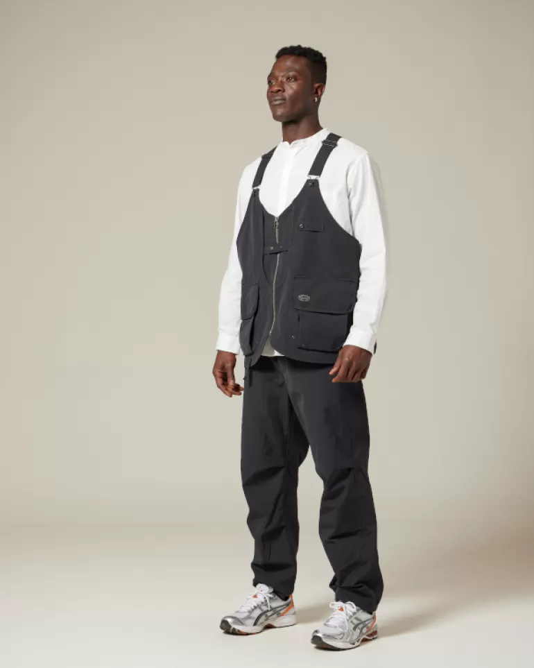 The Takibi Vest is a fire-resistant utility vest. The fabric is aramid and cotton for water repellency and fire resistance. The vest features adjustable straps with metal buckle closures, a zip front with a chest snap, dual oversized pouch pockets with hook-and-loop secured envelope flaps, dual side loops, oversized back storage pouches, and an additional storage loop at the curved hem. Pair the Takibi Vest with the Takibi Over Pants for a matching set.