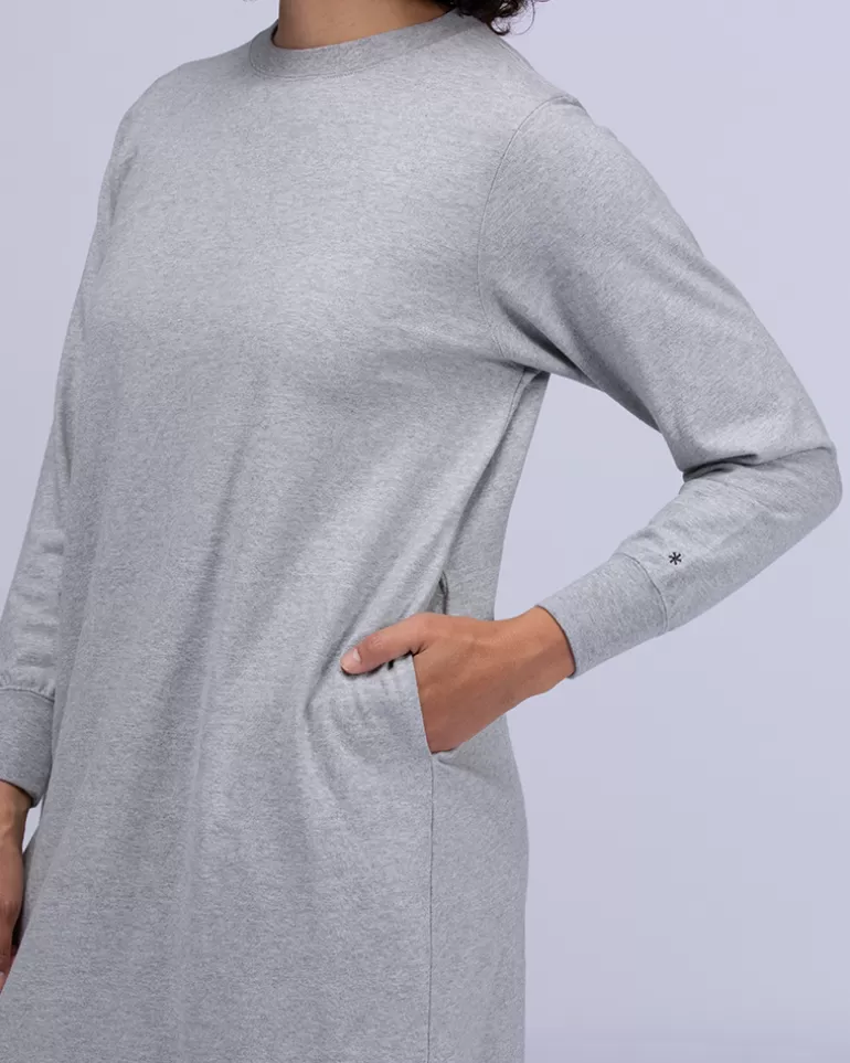 The Recycled Cotton Long Sleeve Dress is an oversized pullover dress. It is made of upcycled cotton that is resistant to pilling. The dress features a crewneck, long sleeves, and a straight hem.