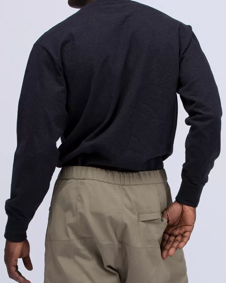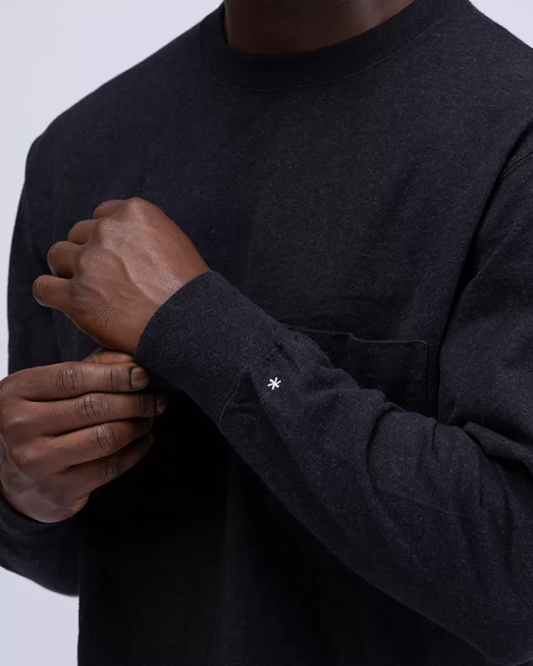 The Recycled Cotton Long Sleeve T-Shirt is designed to fit loose on the body. We recommend taking your normal size for a standard fit. The model stands 6′ and wears size L.